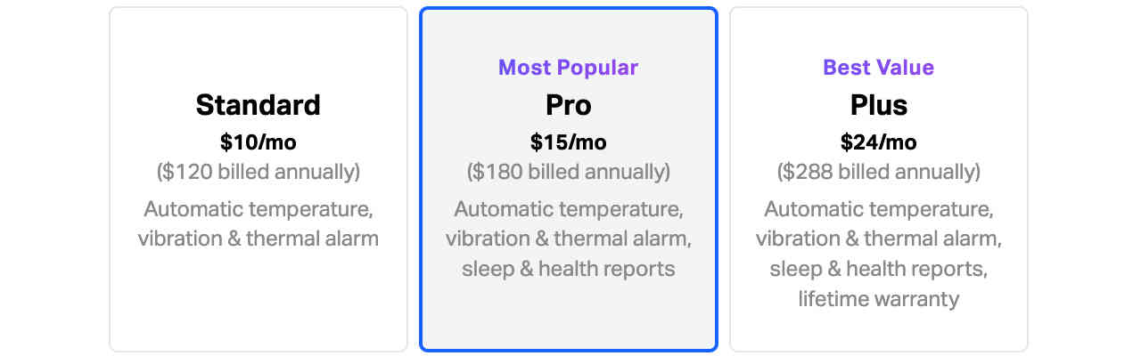 The first Standard tier offers automatic temperature and the vibration + thermal alarm system. It is best for those that are looking for temperature management and don't need extra sleep health data.