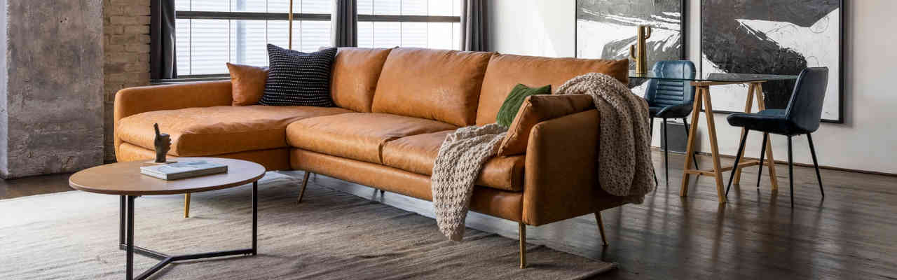 I looked for almost a year for the perfect non-traditional, caramel leather couch and knew when I saw this one I had to have it. It is so cute and is the perfect size for our small apartment. The gold feet are my favorite part. There was some damage done on the cloth located on the underside of the couch that must have happened during travel but the service dept. took care great care of the issue and I am super happy with the purchase!