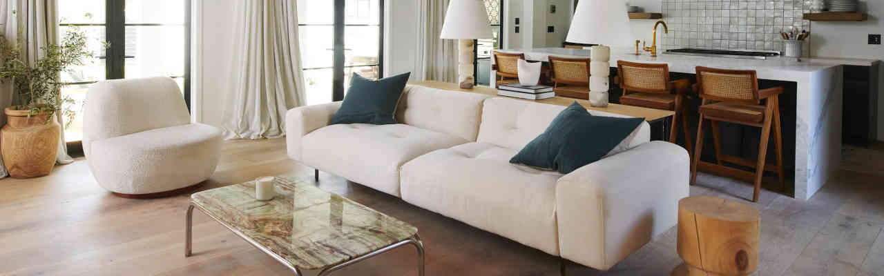 Industry West offers a variety of sofas and sectionals that come with leather, velvet, synthetic, and even woven cane upholstery. They range from $1,340-$8,950. They also have modular sofa options that include leather and synthetic upholstery options. Customers describe mostly comfy feeling sofas, ideal for napping and relaxing, with some exceptions mentioning construction details.