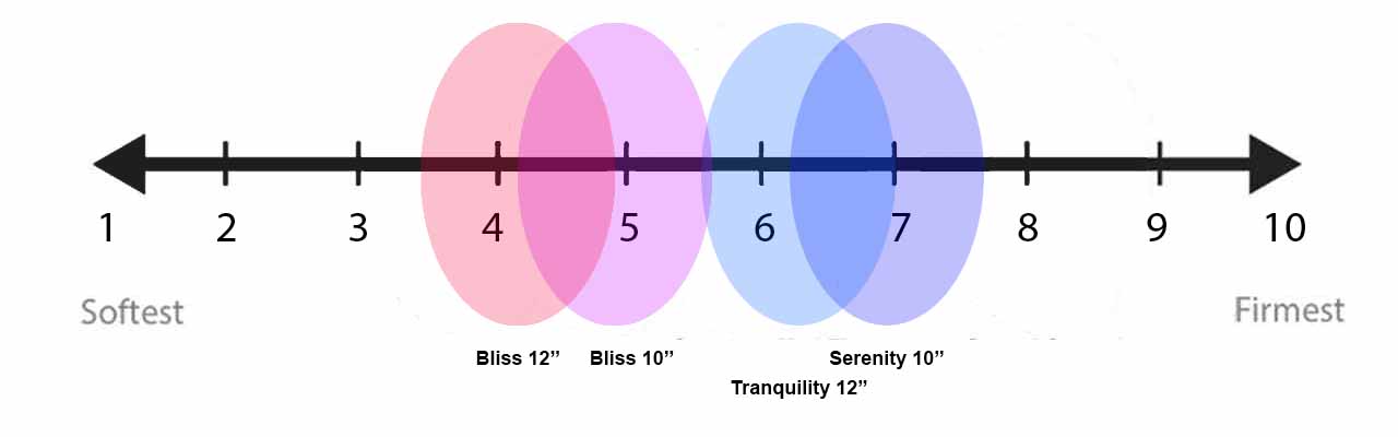 Novilla's Bliss mattresses offer a medium and medium-soft feel, with the 12'' version providing a more pressure relieving surface. The Tranquility and Serenity offer a firmer feel with the Tranquility's thicker comfort layers providing additional cushioning to offset the firm coils.